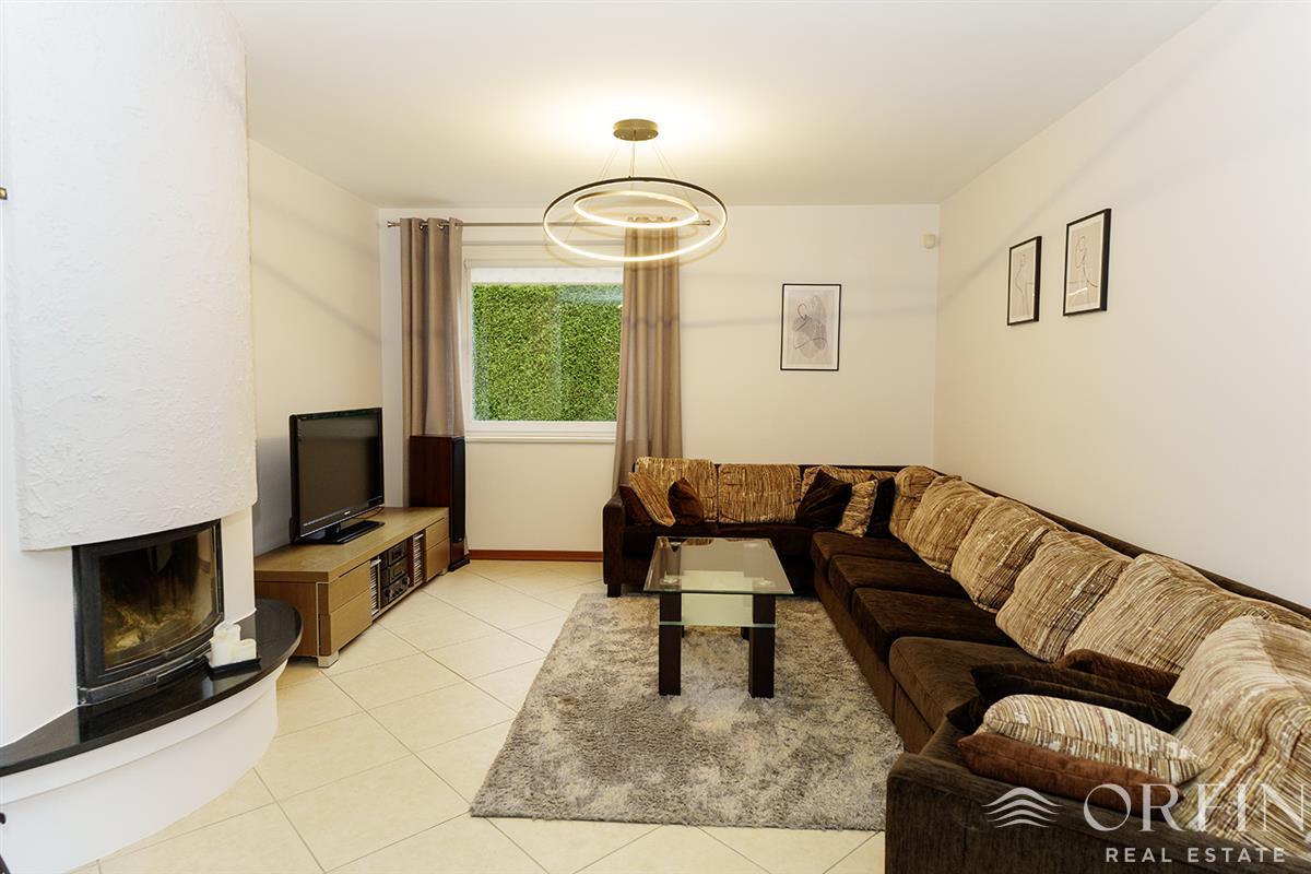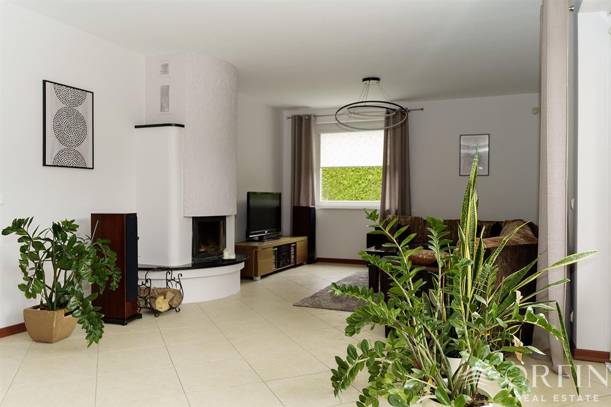 duży, jasny salon z wyjściem na urządzony taras i ogród, kominek,