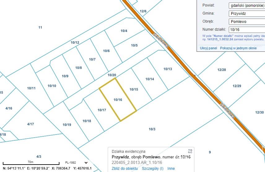 Działka budowlana znajduje się w miejscowości Pomlewo przy ulicy Świerkowej. Położona jest w otoczeniu zieleni. Pomlewo mieści się w gminie Przywidz, na Kaszubach, blisko Gdańska. Działka jest dobrze skomunikowana: 5 minut zajmie nam dojazd do najbliższego jeziora w Przywidzu, niecałe 30 km do Centrum Gdańska, 31 km dzieli nas od lotniska w Gdańsku, w najbliższej okolicy znajduje się stadnina koni, najbliższe sklepy znajdują się w odległości 1,5 km, kawiarnia i pizza w odległości 2,5 km, zaplecze medyczne i szkoły w odległości 3,5 km w Przywidzu. Dojazd z DW nr 221, następnie gminną drogą szutrową.