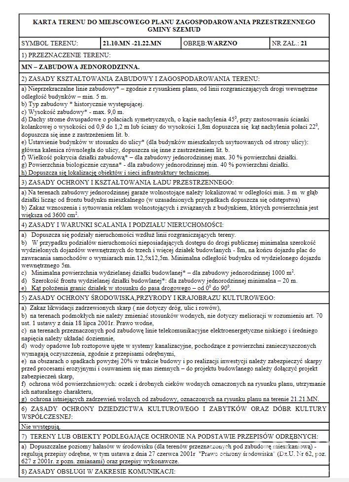 Działki budowlane w Warznie przy ul.Polnej o pow. od 1000m2 do 1500m2, wydzielone, teren z małym spadkiem. Uzbrojenie w drodze przy ul. Polnej. Teren objęty aktualnym MPZP- Max. wysokość 9m, pow. zabudowy do 30%, dachy dwu i wielospadowe. Działkio położone w sąsiedztwie nowego osiedla domów jednorodzinnych; w otulinie lasu i terenów rekreacyjnych w odległości ok. 500m od jeziora. Do ceny należy doliczyć 10 000,- za udziały w drogach wewnętrznych dojazdowych do działek. Niniejsze ogłoszenie nie stanowi ofert handlowej w rozumieniu K.C.