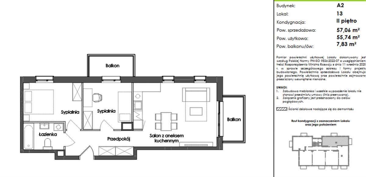 Apartament o powierzchni całkowitej 57,06 m2 (powierzchnia użytkowa 55,74 m2) składa się z dwóch sypialni, dużego salonu z aneksem kuchennym, przedpokoju, oraz łazienki. Dzięki przemyślanym projektom i odpowiedniej aranżacji mieszkanie staje się bardzo funcjonalne i komfortowe. Z salonu i jednej sypialni znajdują się wyjścia na dwa balkony każdy o powierzchni 3,92 m2. Ogrzewanie w każdym bloku jest gazowe, dbając o ekologię.