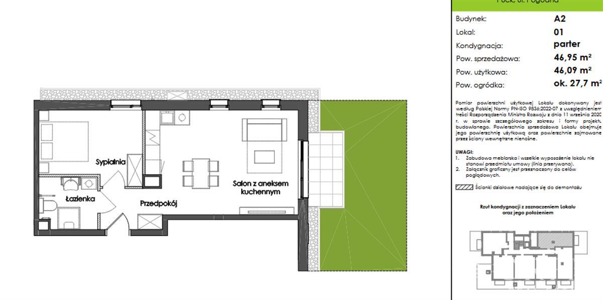 Apartament o powierzchni całkowitej 46,95 m2 (powierzchnia użytkowa 46,09 m2) składa się z sypialni, dużego salonu z aneksem kuchennym, przedpokoju, oraz łazienki. Dzięki przemyślanym projektom i odpowiedniej aranżacji mieszkanie staje się bardzo funcjonalne i komfortowe. Z salonu znajduje się wyjście na przestronny ogród o powierzchni 27,7 m2. Ogrzewanie w każdym bloku jest gazowe, dbając o ekologię.