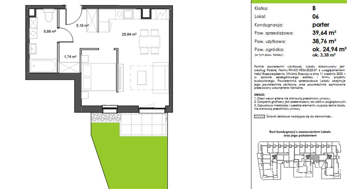 Mieszkanie o powierzchni użytkowej 38,76 m2 z tarasem 3,38 m2 i ogrodem 24,94 m2, mieści się na parterze 3 piętrowego budynku wyposażonego w windę. Mieszkanie środkowe o wschodniej ekspozycji okien. Rzut mieszkania w załączeniu.